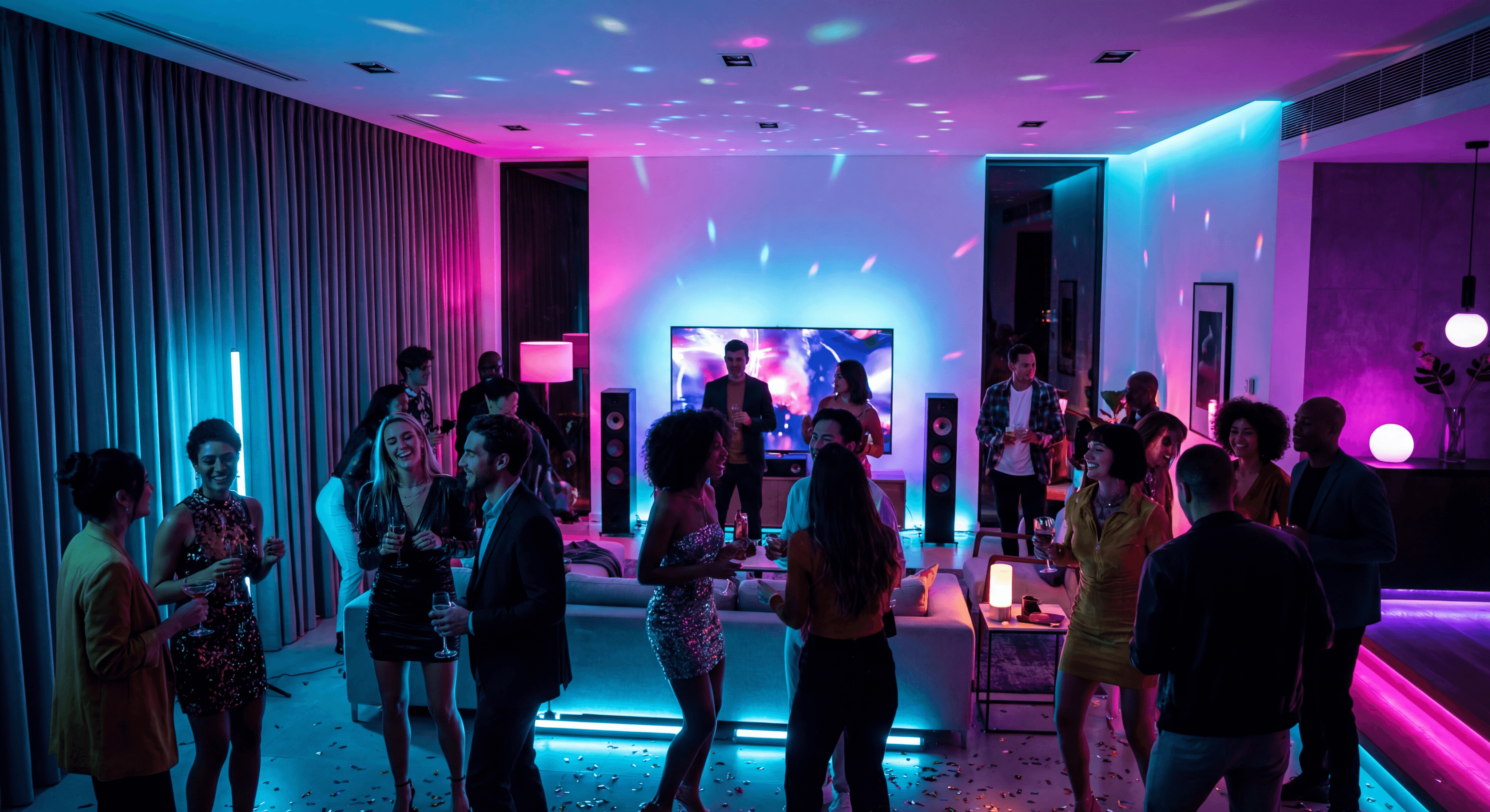 Мгновенно превратите дом в клубное пространство. Нажмите кнопку на смартфоне, и система сама задвинет шторы, запустит светомузыку и включит ваш любимый танцевальный плейлист.